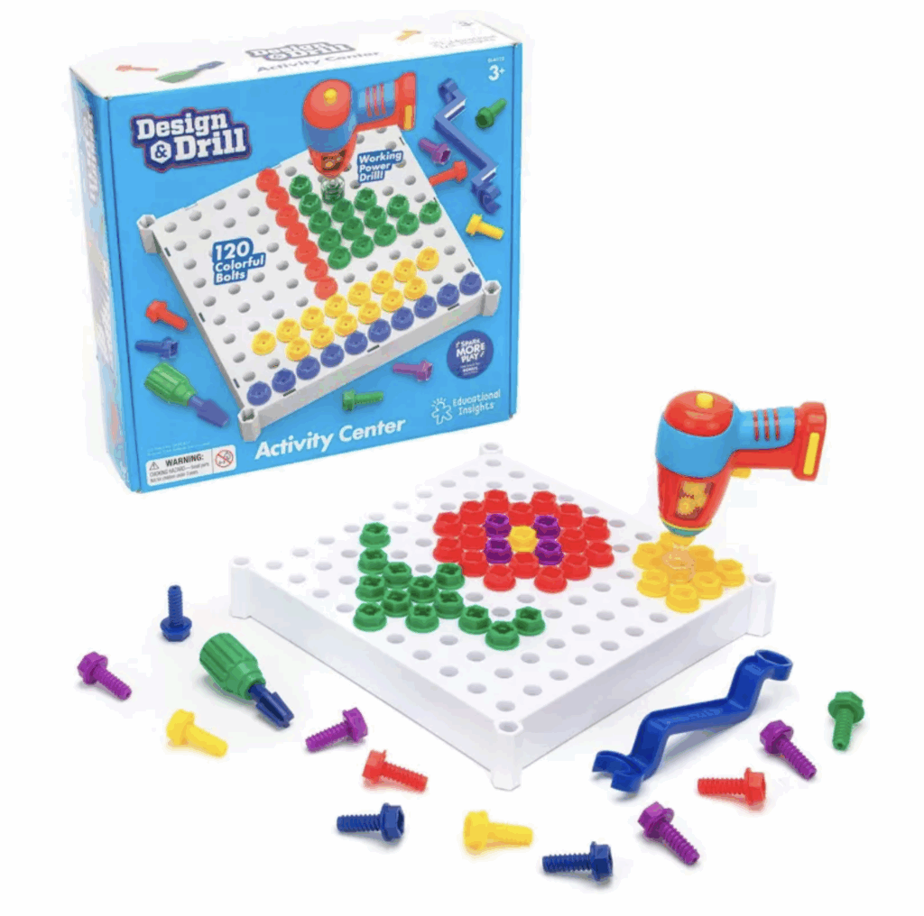 Where construction meets creativity. Your toddlers can snap any of the included drill bits into the power drill or toy screwdriver, grab a handful of big bolts, and power up fine motor skills while designing their own creations or using one of the 20 colorful pattern cards included. Perfect educational activity they will love!